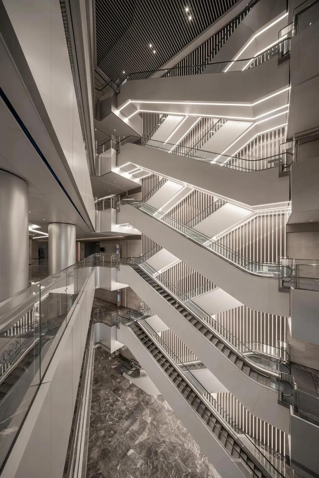 中庭处链接各个楼层的电动手扶梯,同样使用定制线形灯提供照明功能,流畅的线条感与建筑相呼应,指引着行人前行的方向。
