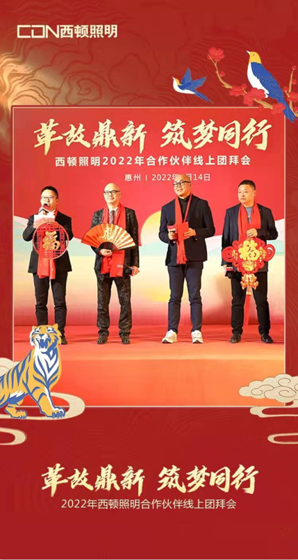 2022年1月14日,以“革故鼎新·筑梦同行”为主题的2022年西顿照明合作伙伴线上团拜会圆满举办。本届团拜会于公司总部设立主会场,同时联动设置全国三大营销中心(北京、上海、重庆)分会场。伴随着万元红包雨的掉落,全国合作伙伴及各系统部门等1200余人打破空间阻隔,相聚云端。