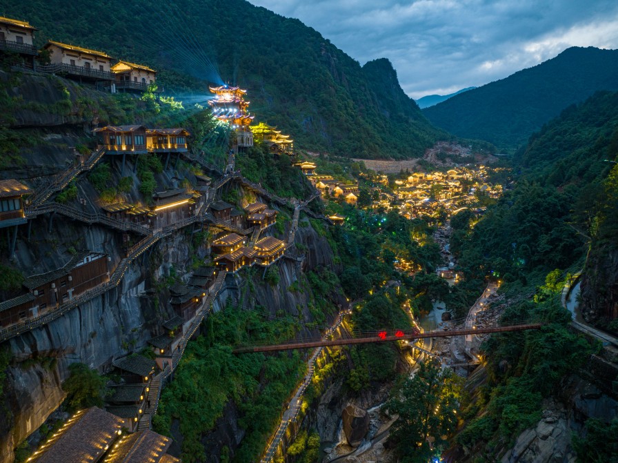 白鹤崖,垂直高度110多米,建有崖上民宿、悬空玻璃客房、悬崖图书馆和悬崖餐厅、高空观景台,可以俯瞰望仙谷全景。远远望去,高山上层层叠叠的房屋依山而建,深沟峡谷、悬崖峭壁,搭配夜间点缀于房屋上的灯光,宛如身临奇幻的“仙侠世界”,满眼所见,流光溢彩。