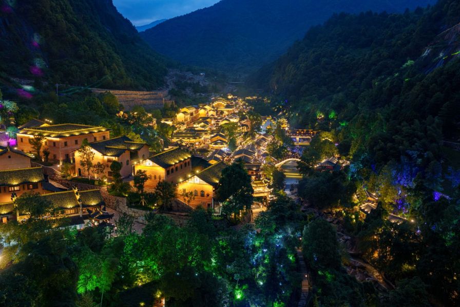 走在青石板街,穿越村落,在山野峡谷中闲适地漫谈,在百舸桥遇轻抚的山风,在岁月留痕的木门旁闲坐,慢看白云初晴,幽鸟相逐,赏云卷云舒,享受“偷得浮生半日闲”的慢时光。与自然作别后,可去蝉鸣街体验木雕、竹蔑手作,受传统非遗文化的魅力;或去热闹熙攘的老街商铺与戏台,看一场场传统民俗节目表演。夜幕降临,家家户户亮起的灯光晕染了仙谷,余光与灯光秀一同照进了瀑布,融入了溪谷,景区宛如仙境一般。