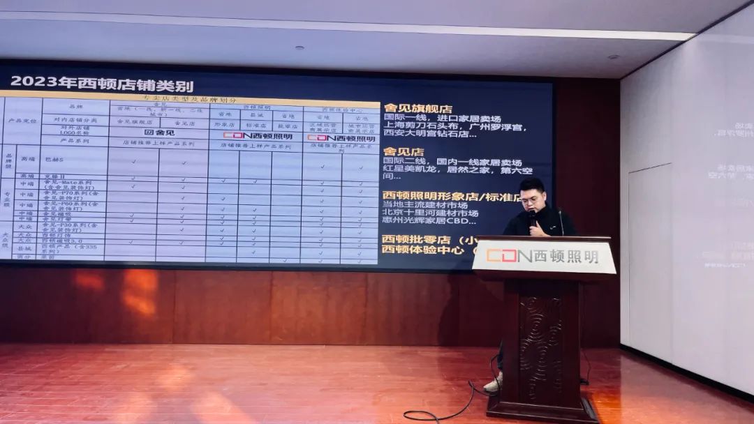 会上,惠州市西顿工业发展有限公司国内销售系统副总经理李卓为本次会议进行致辞;西顿照明ToC行业发展中心运营总监程进对西顿照明渠道策略与局势规划进行分享;西顿照明高级产品经理罗鉴华为大家详细地介绍本次的产品主角——舍见与莱茵系列;西顿照明品牌部部长陈铭钊讲解西顿店铺形象SI。