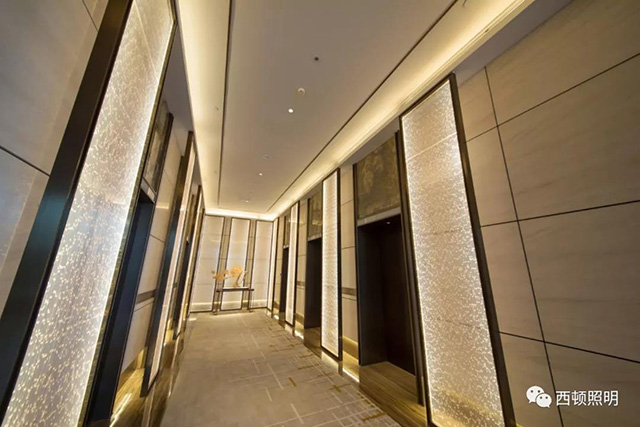 为缓解深色系装饰材料给空间带来的沉闷感,将灯光融入到挡板的间隙中,差序摆放形成波浪形灯带,达到装饰照明的效果,指引宾客走向电梯厅。