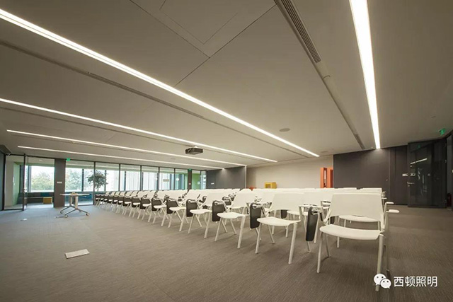 汇报厅与阶梯教室,均选用线形照明ML系列,搭配线条灯、格栅射灯、筒射灯四大照明模块,实现多种会议场景光效切换。