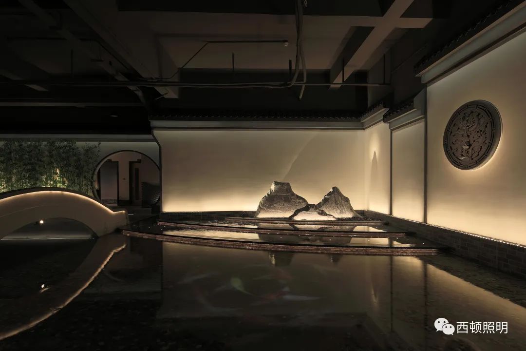 西顿照明中山基地的室外照明展厅,含品牌故事区、场景体验区、视觉媒体长廊、产品体验陈列区等区域。将室外山水、庭院用抽象的元素模拟到室内空间,打造出一个婉约又柔美的徽派建筑场景。让嘉宾感受室外灯光魅力的同时,综合展示西顿室外照明理念、产品与解决方案。