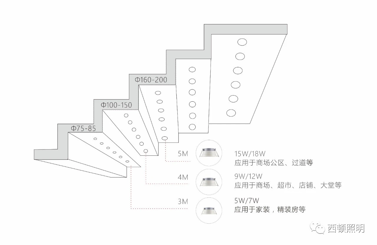 LED筒灯作为基础照明,是为了保证空间的亮度达到一定标准而设置的,不同高度的空间里,需要采用不同功率的LED筒灯排列。针对这种情况,下图为H系列Ⅲ代就空间高度与筒灯功率间的“匹配标准”。