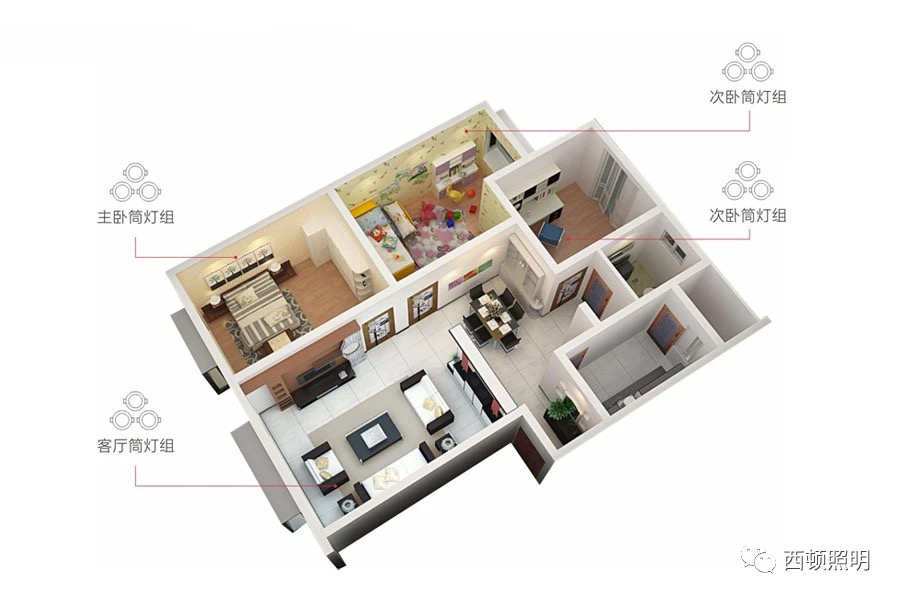 在家居空间里,卧室、客厅均可选择筒灯实现基础照明。